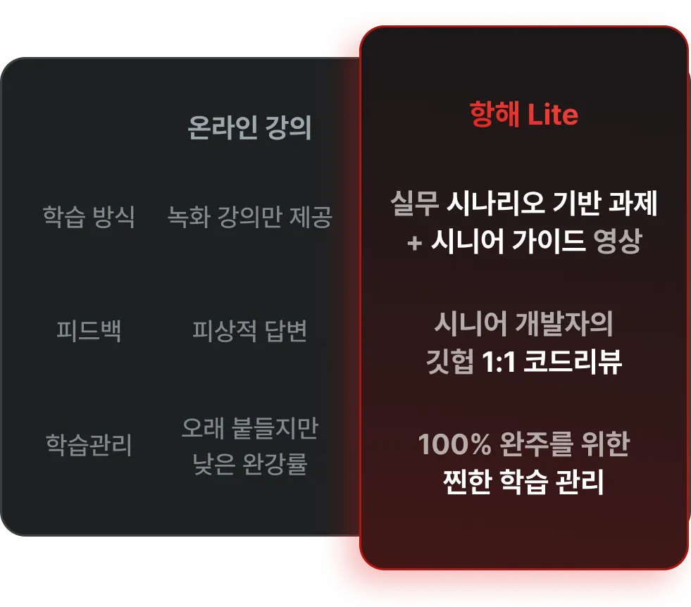 백엔드 실무 역량 향상이 공통 목표이지만, 학습 방식과 몰입 강도, 운영 방식에서 차이가 있습니다.